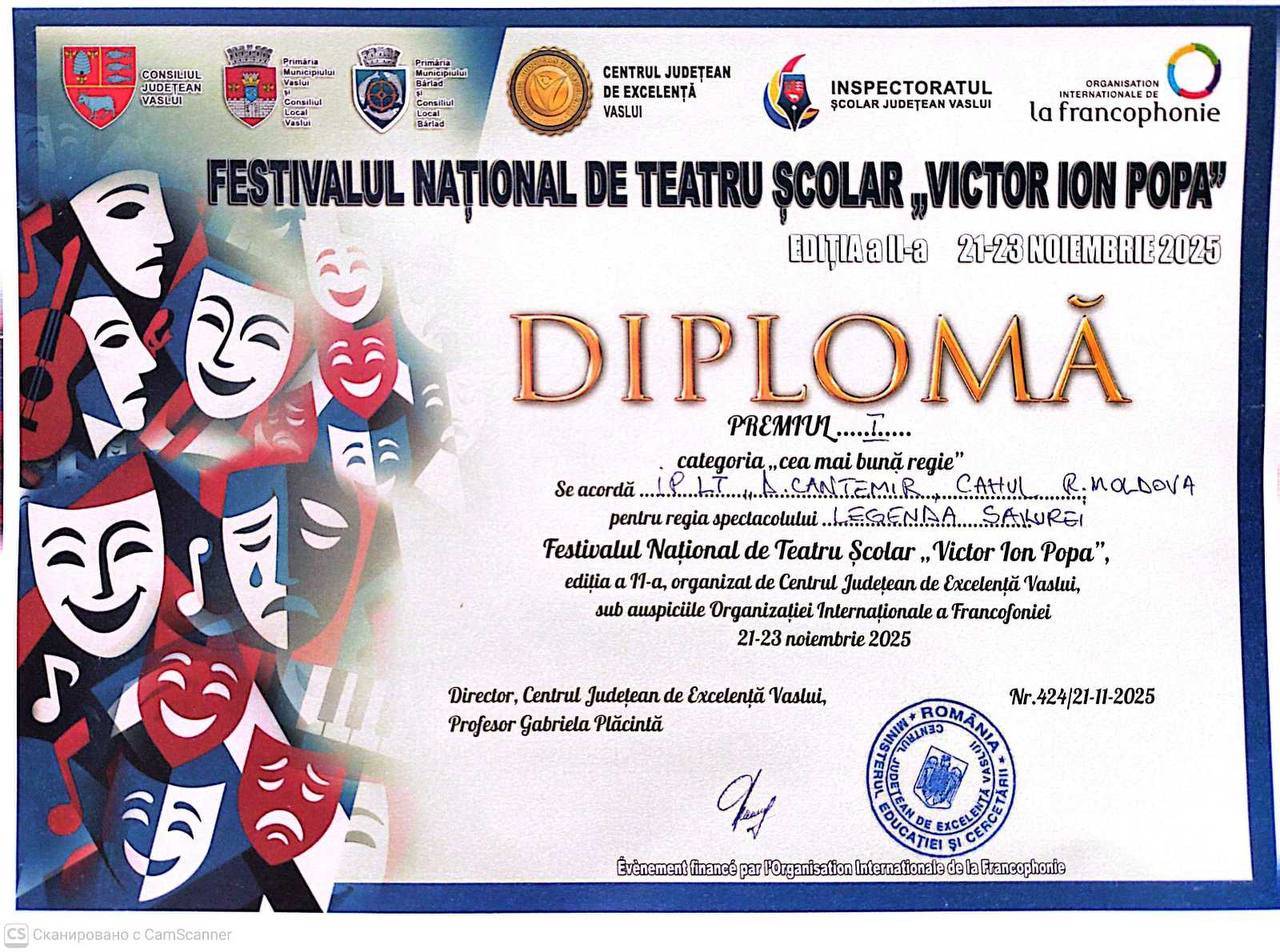 Trupa de teatru a Liceului Teoretic „Dimitrie Cantemir” din municipiul Cahul a obținut locuri premiante la Festivalul Național de Teatru Școlar „Victor Ion Popa”, ediția a XI-a, desfășurat în perioada 21–23 noiembrie 2025. Evenimentul a fost organizat de Centrul Județean de Excelență Vaslui, sub auspiciile Organizației Internaționale a Francofoniei.
