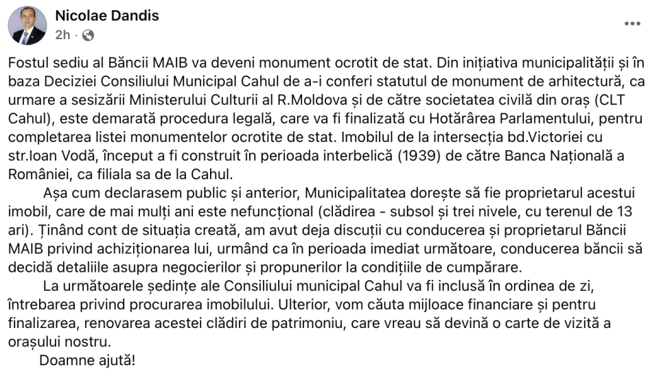 Fostul sediu al Băncii MAIB din municipiul Cahul urmează să fie inclus în lista monumentelor ocrotite de stat. Anunțul a fost făcut de primarul municipiului Cahul, Nicolae Dandiș, care a precizat că procedura a fost inițiată din inițiativa municipalității și în baza unei decizii a Consiliului Municipal Cahul.