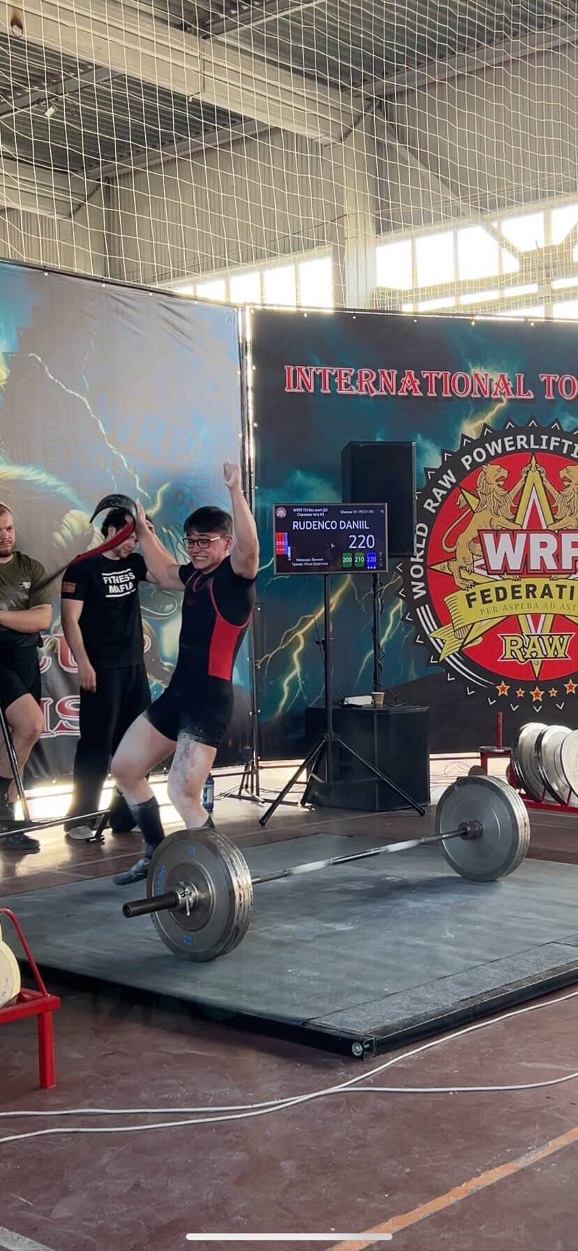 „Daniil Rudenko, în vârstă de 18 ani, cu o greutate corporală de 72,6 kg, a înregistrat următoarele rezultate: genuflexiuni – 205,5 kg, împins la piept – 117,5 kg, îndreptări – 220 kg, totalul fiind de 543 kg. El a stabilit două recorduri mondiale: la genuflexiuni fără echipament (probă individuală) și la powerlifting fără echipament (în cadrul celor trei probe). Totodată, a obținut locul I în clasamentul absolut la categoria juniori.”