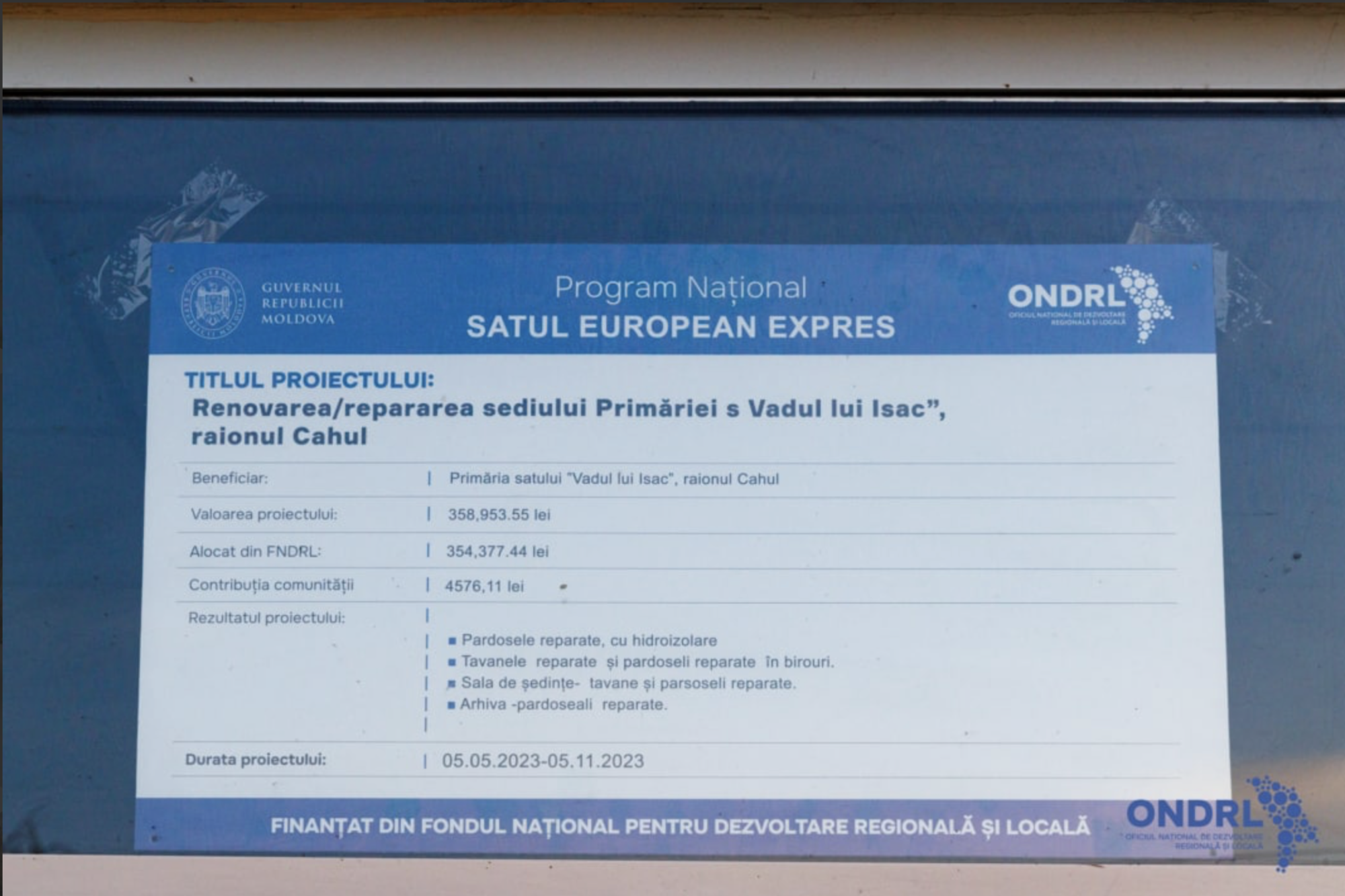 Anterior, localitatea a beneficiat și de proiectul „Renovarea sediului primăriei satului Vadul lui Isac”, realizat prin Programul „Satul European Express”. Lucrările au inclus reparații interioare, termoizolarea pardoselilor și renovarea tavanelor clădirii cu o vechime de peste 40 de ani.