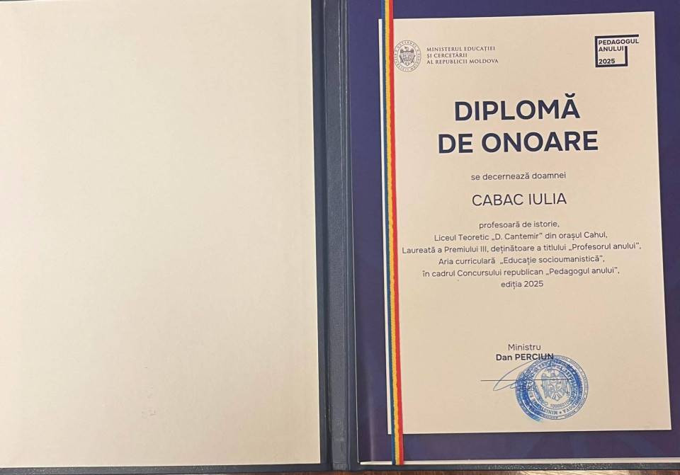 Преподаватель истории румын и всеобщей истории Юлия Кабак из Государственного лицея «Димитрий Кантемир» муниципия Кагул была удостоена звания лауреата Республиканского конкурса «Педагог года – 2025», заняв III место.