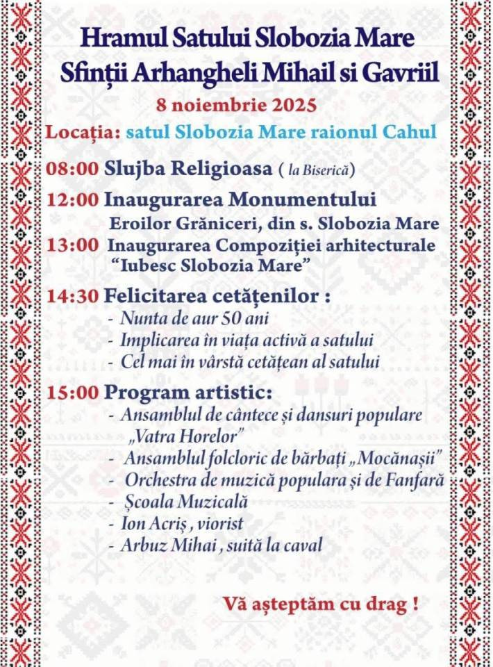 Община села Слобозия Маре, Кагульского района, отметит 8 ноября 2025 года день храма — Святых Архангелов Михаила и Гавриила. Примар Валентина Карастан объявила полную программу мероприятия, которая включает религиозные обряды, торжественные открытия и насыщенную художественную программу.