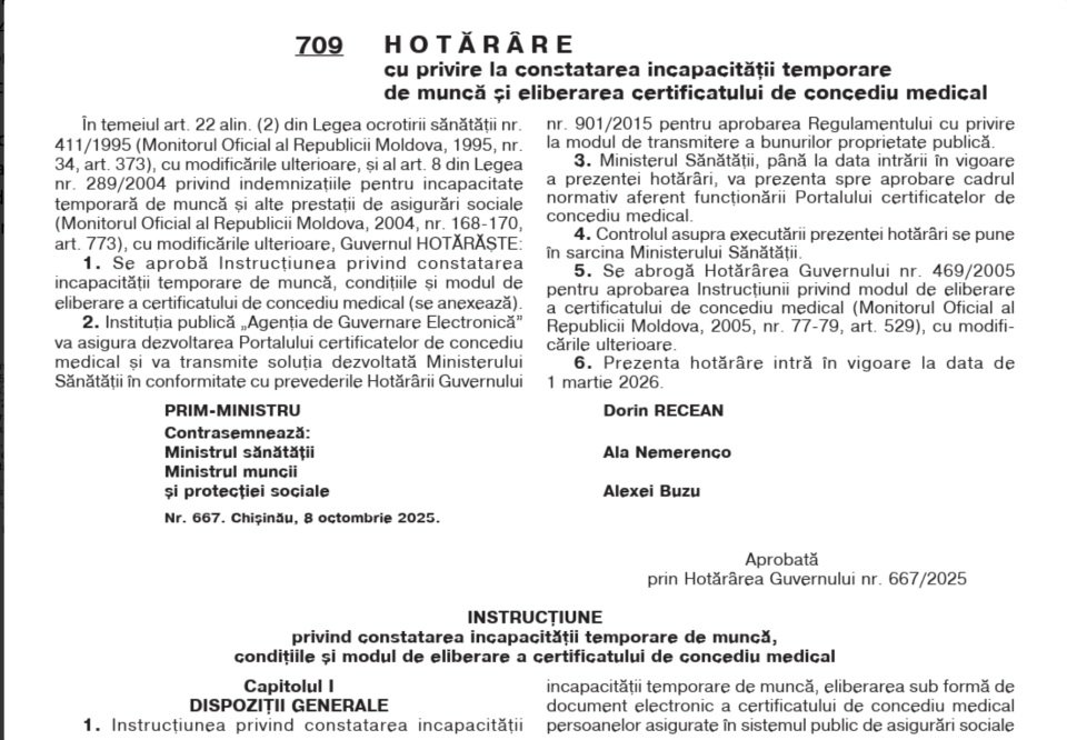Справка о нетрудоспособности будет выдаваться в цифровом формате и будет доступна онлайн. По запросу также может быть предоставлена в печатной форме, с QR-кодом, который позволит проверить подлинность документа. Новые правила вступят в силу с 1 марта 2026 года, согласно постановлению Правительства, опубликованному сегодня в «Официальном мониторе», сообщает MOLDPRES.