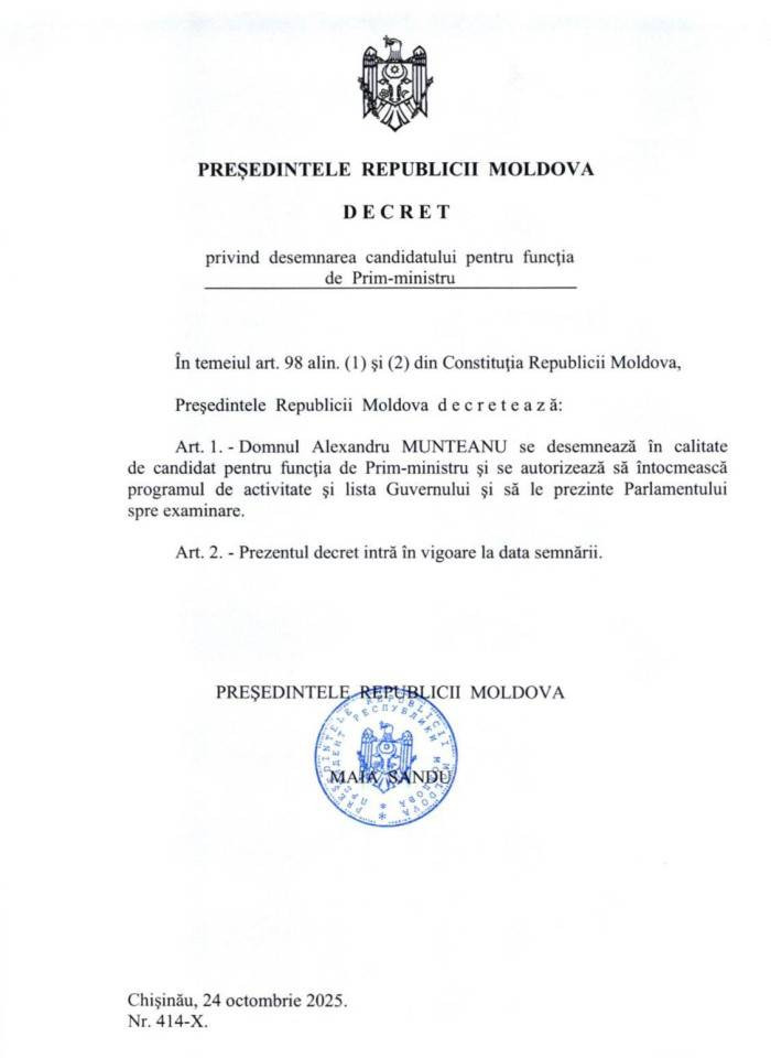 По итогам консультаций с парламентскими фракциями Президент Республики Молдова Майя Санду подписала сегодня, 24 октября 2025 года, указ о назначении господина Александру Мунтяну кандидатом на должность Премьер-министра Республики Молдова.