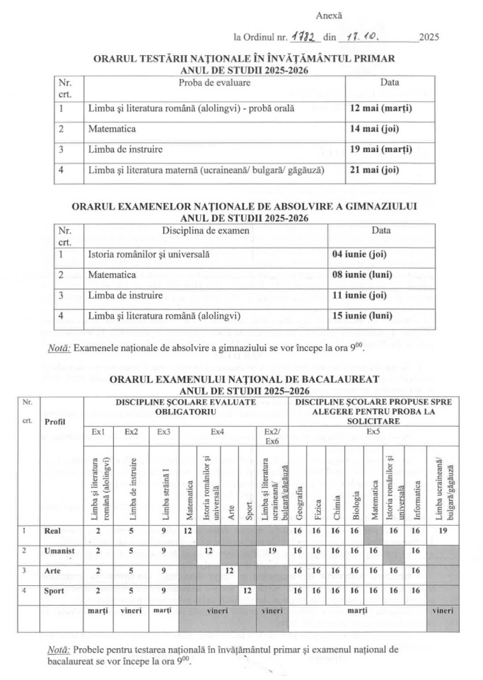 Ministerul Educației și Cercetării și Agenția națională pentru Curriculum și Evaluare au stabilit orarul examenelor naționale de absolvire pentru anul de studii 2025-2026. Toate probele de examene vor începe la ora 9:00, indiferent de disciplină, instituție de învățământ sau centrul de examene. Orarul cuprinde testarea națională pentru clasele primare, examenele de absolvire a gimnaziului și examenul de bacalaureat.