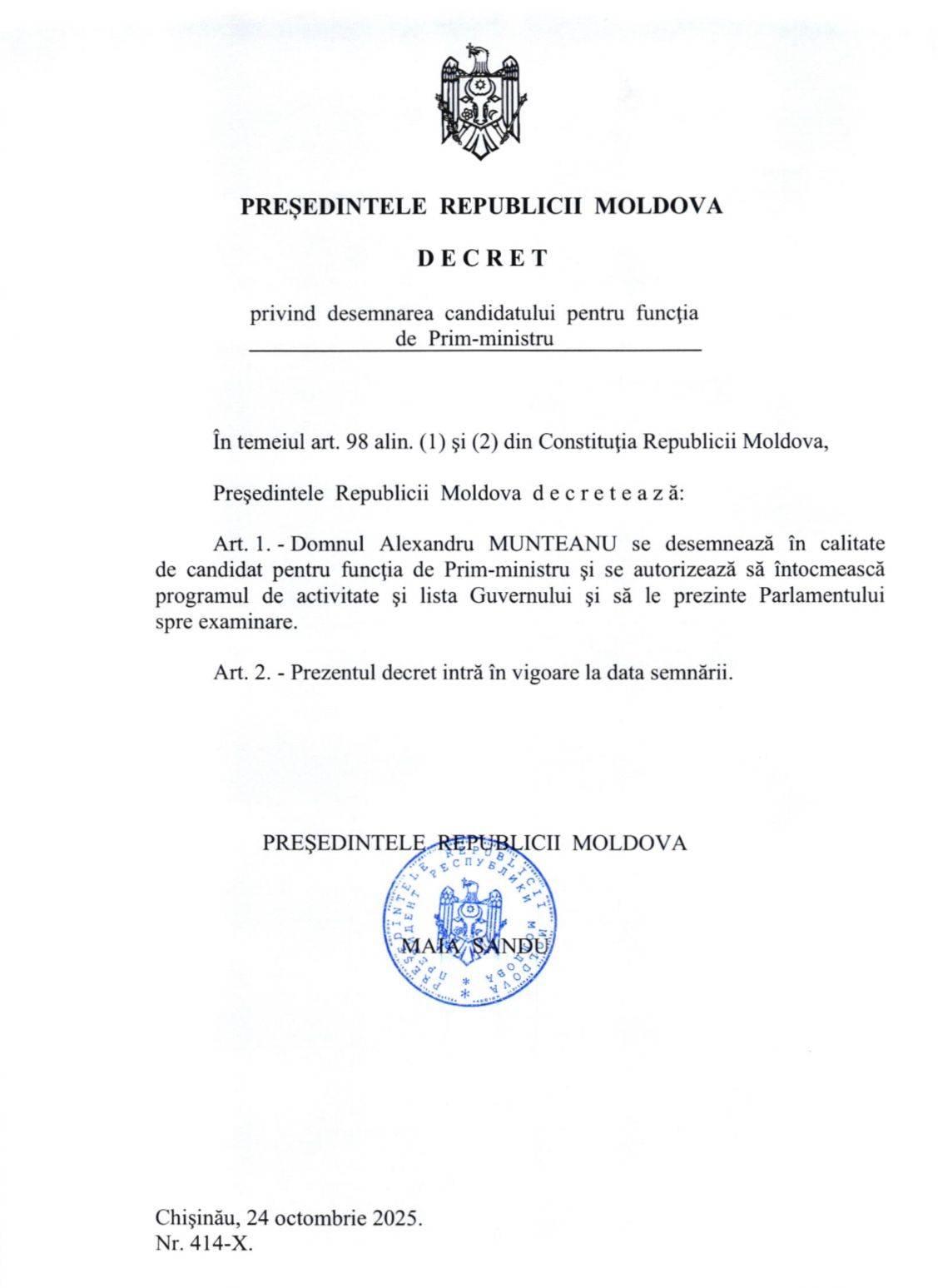 În urma consultărilor cu fracțiunile parlamentare, Președinta Republicii Moldova, Maia Sandu, a semnat astăzi, 24 octombrie 2025, decretul privind desemnarea domnului Alexandru Munteanu în calitate de candidat la funcția de Prim-ministru al Republicii Moldova.