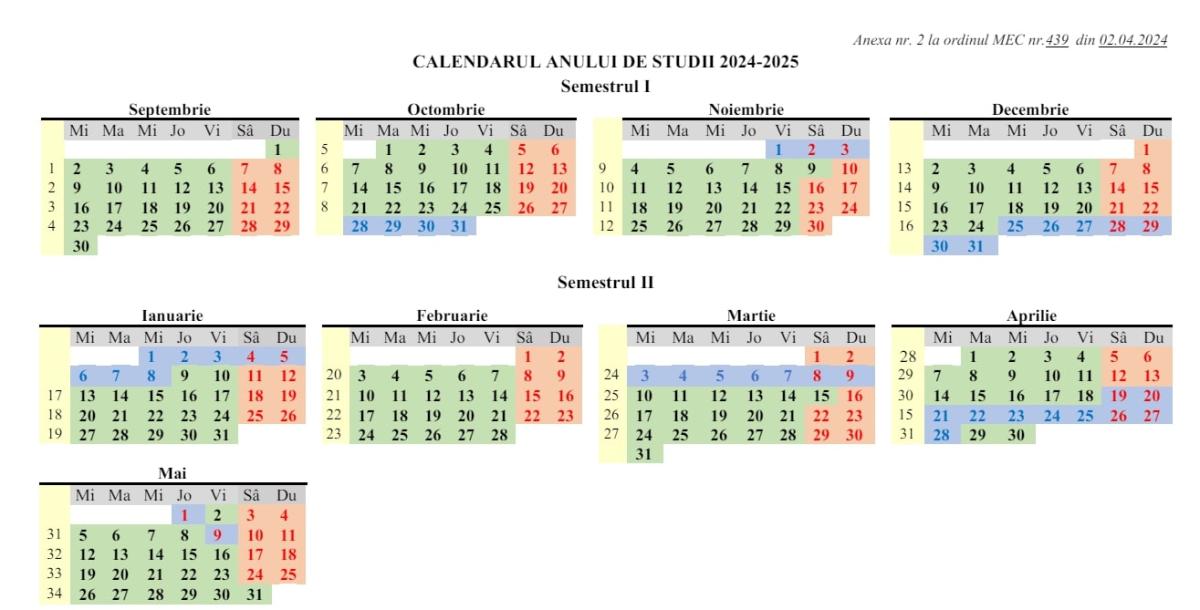 - semestrul I: 1 septembrie – 24 decembrie 2024;